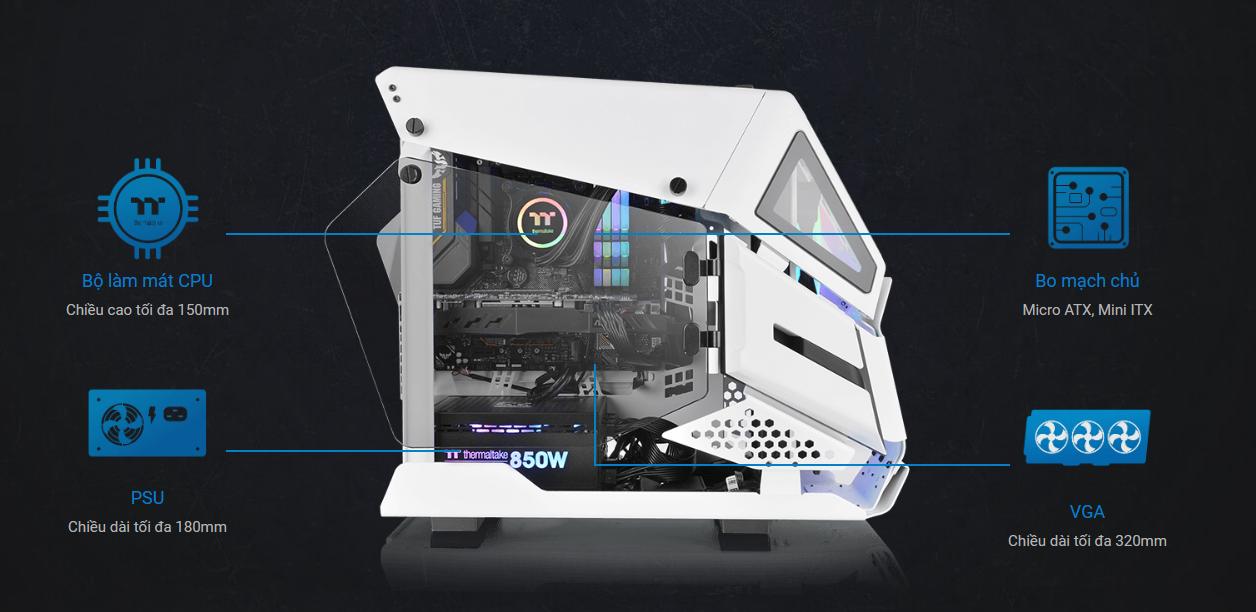 | HỖ TRỢ RADIATOR tản nhiệt nước | Mặt trước: 1 x 240mm hoặc 1 x 120mm 1 x 280mm hoặc 1 x 140mm Chiều cao tối đa của bộ làm mát CPU: 150mm Chiều dài tối đa của VGA: 320mm Chiều dài tối đa của PSU: 180mm Giới hạn độ dày 3.5 ”của HDD: 22mm |