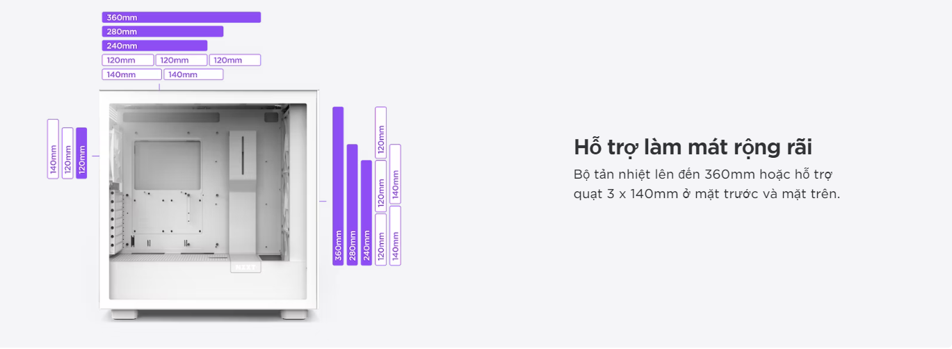 | Hỗ trợ tản nhiệt | Mặt trước : Lên đến 360mm với Đẩy/Kéo Hàng đầu : Lên đến 360mm Phía sau : Lên đến 140mm |